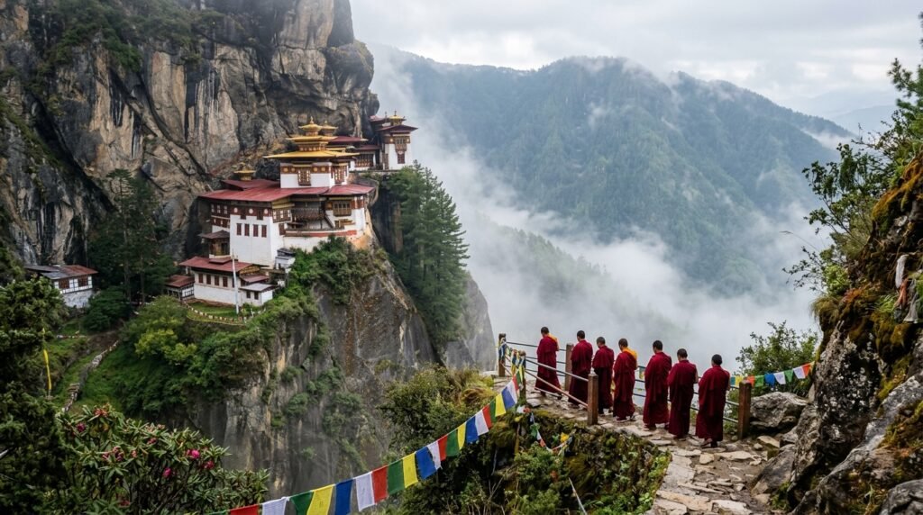 The Himalayan nation depends on Gross National Happiness as its main method for assessing national development while the country keeps its carbon-negative condition and its citizens still wear traditional clothing and its ancient monasteries rest upon mountain cliffs.