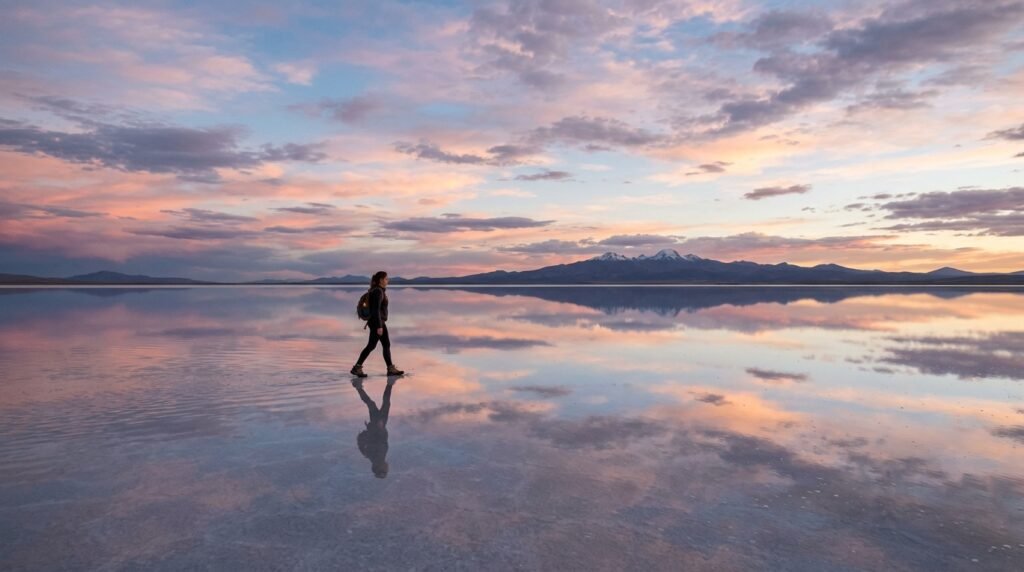 The rainy season transforms Salar de Uyuni salt flats into the largest natural mirror that exists on Earth and the ground reflects the sky in such a precise manner that observers cannot see where the horizon starts which results in an endless visual field that photographers use to create their work.