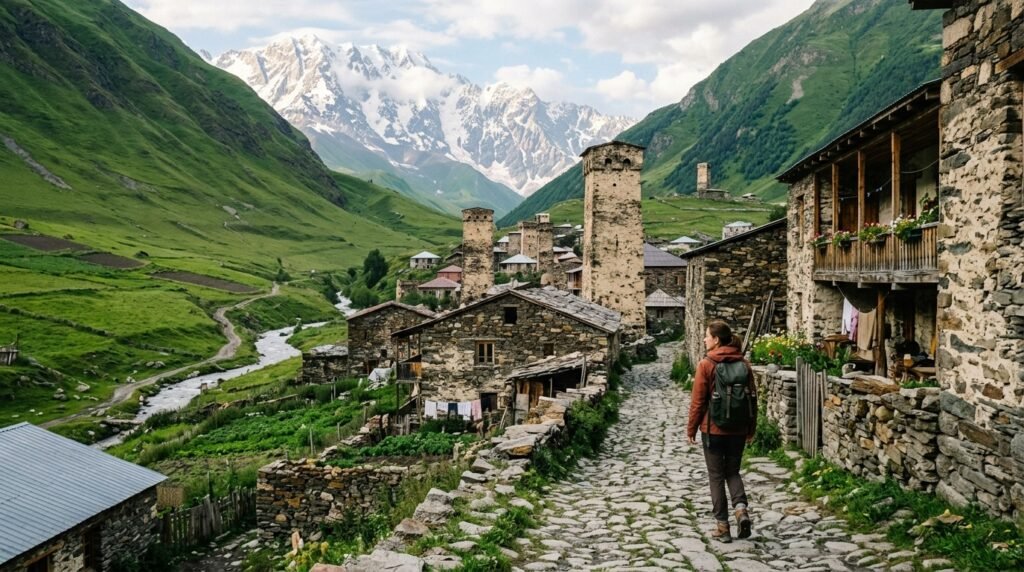 Georgia combines ancient stone towers with green valleys in its mountain setting and the country is well-known for its Supra feasts which feature a special toastmaster who guides guests through several hours of storytelling and music and traditional food tasting.
