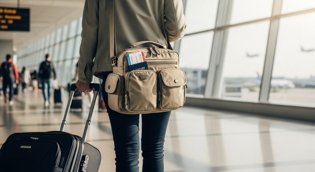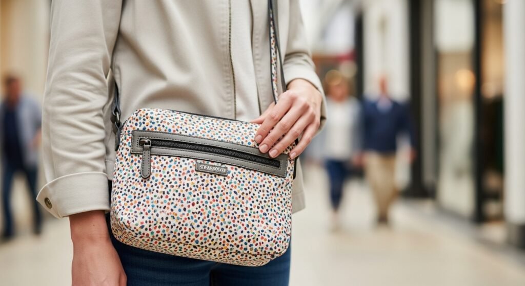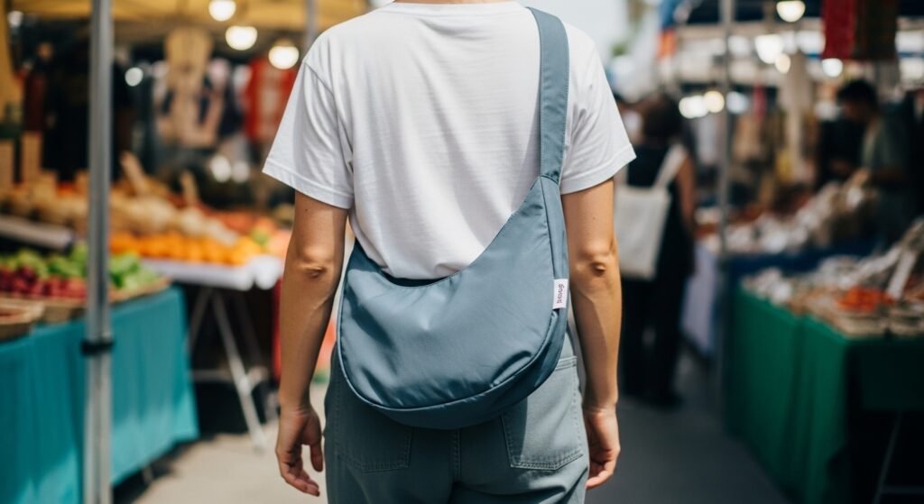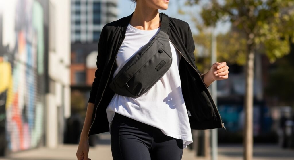 The upgraded version (not the tiny festival one) is surprisingly stylish in black, bone, or soft pastels. Water-resistant fabric, multiple pockets, adjustable strap that doubles as a belt. Extremely popular for errands because it’s lightweight and hands-free.