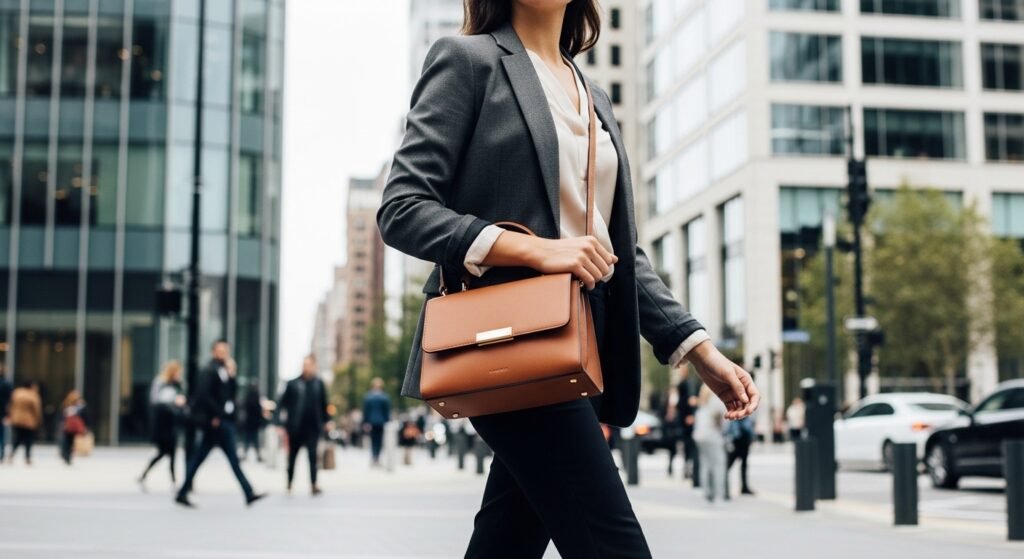 Structured leather bag that can be worn crossbody or as a top-handle. Interior organization, hidden pockets, and luxe hardware. Looks expensive and professional but still casual enough for daily use.