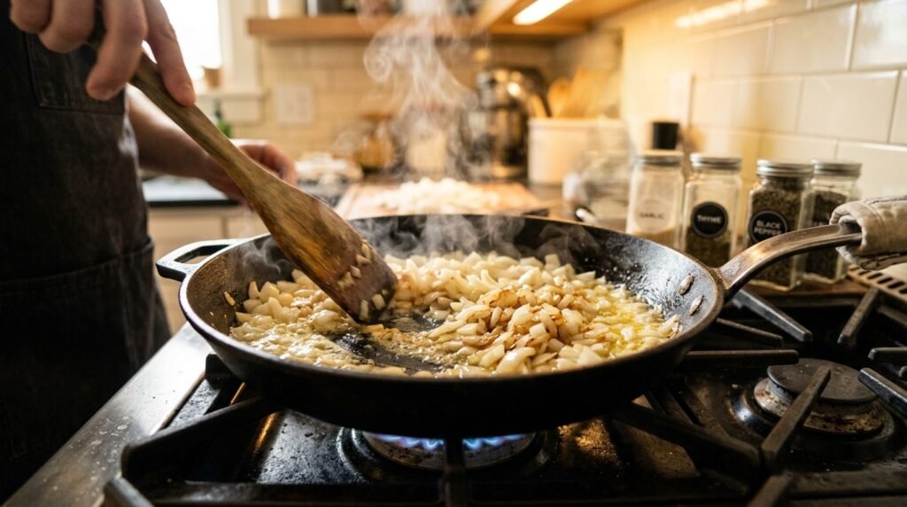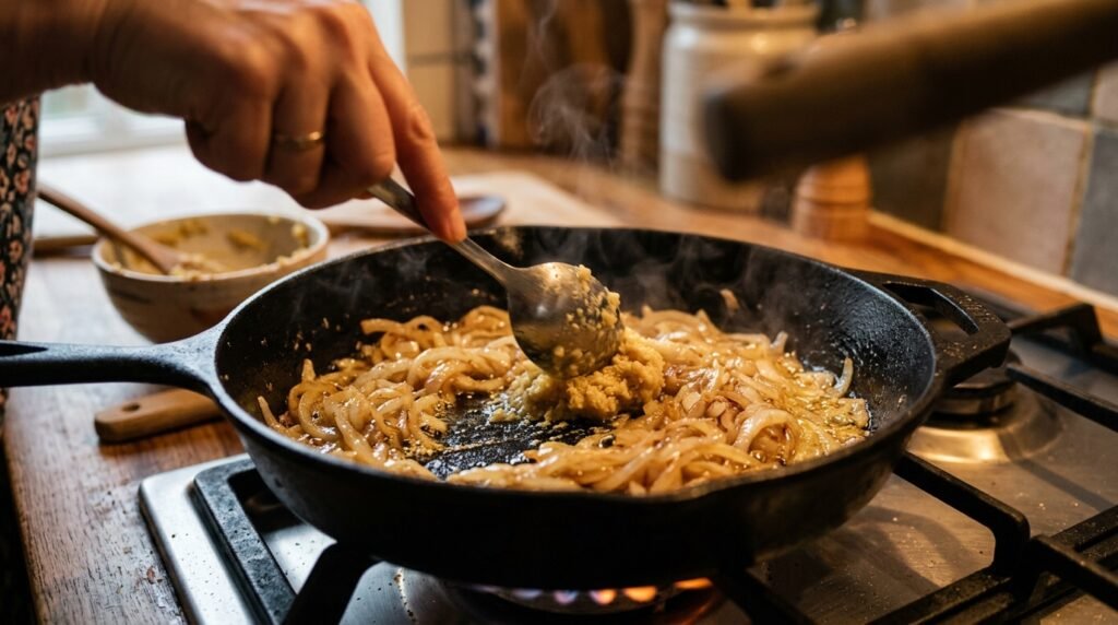A large flat pan requires a generous cube of butter to melt. You need to add finely chopped onions to the cooking process until they achieve translucent and soft texture. The cooking process should maintain light browning because you need to create base flavors which have a sweet taste.
