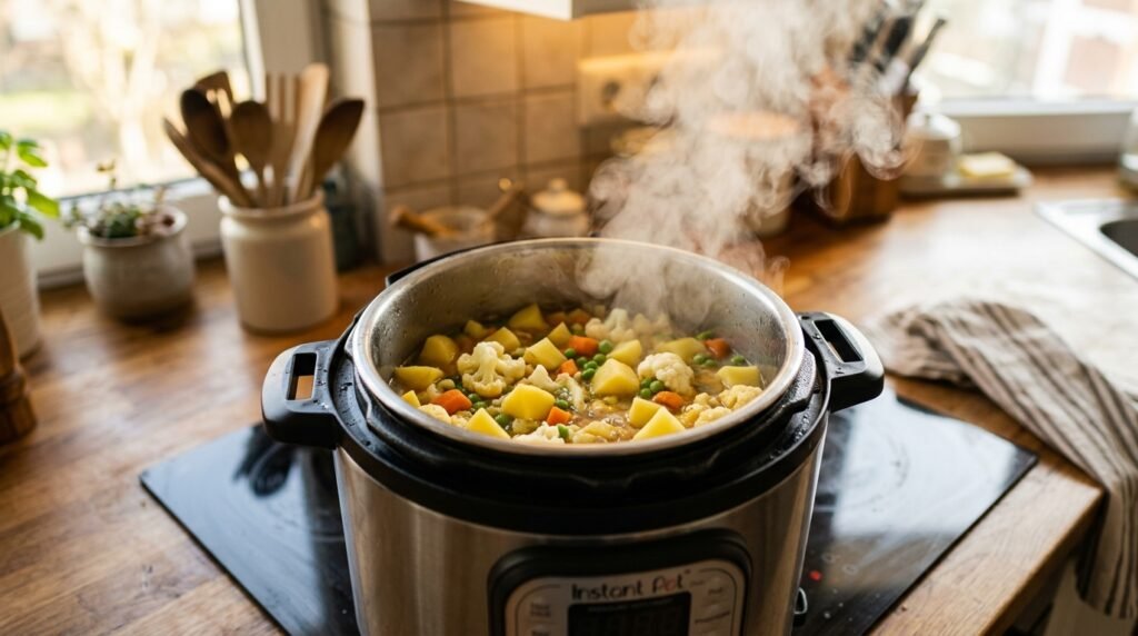 The pressure cooker should contain chopped potatoes along with cauliflower florets and green peas and carrots together with some water and a little salt. The cooking process needs three to four whistles for complete softening into a mushy state which prepares the ingredients for blending into a smooth base.