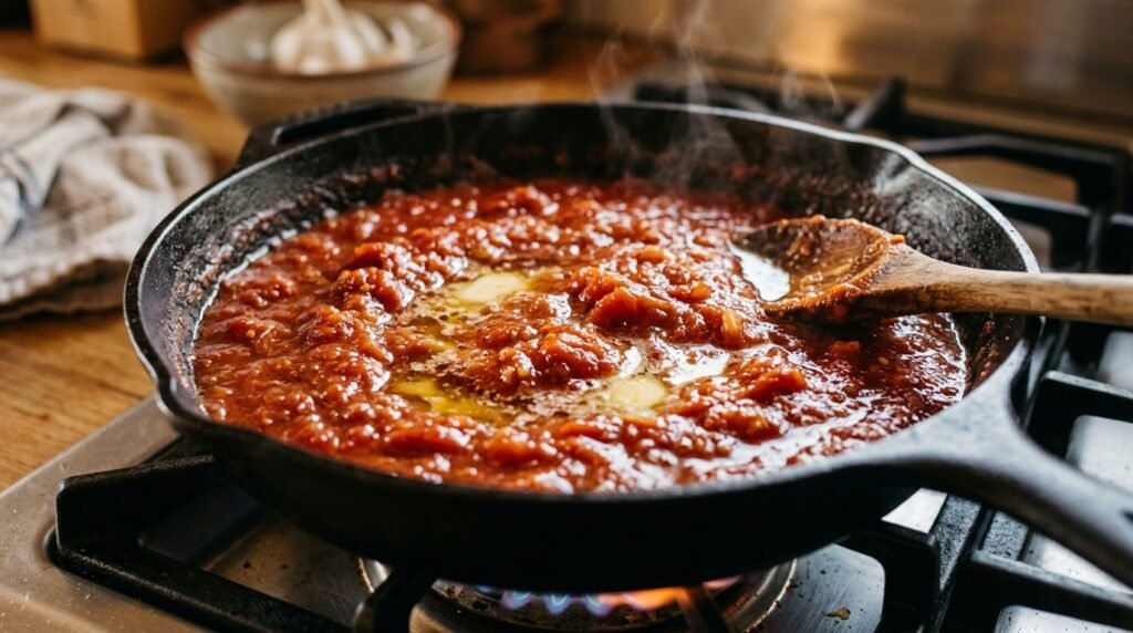 Add diced tomatoes to the pot together with a small amount of salt and the cooking process should continue until they reach a jam-like consistency of soft pulpy texture. Real street vendors permit the oil (or butter) to begin separating from the tomato mixture.