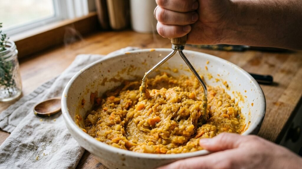 The boiled vegetables should have all water removed before using a heavy potato masher to crush them in the pot. The street-style texture requires complete grinding of vegetables which should result in a thick vegetable paste without any remaining large chunks.
