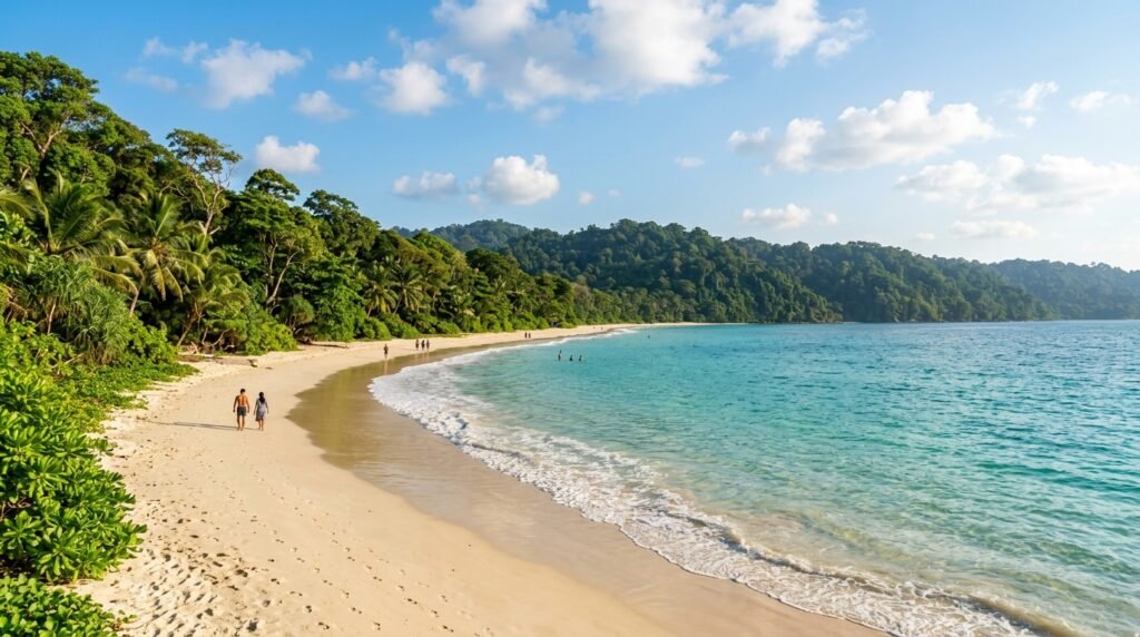 Another white sandy water beach is the Radhanagar Beach situated within Havelock Island. The beach also appears more magical due to the use of gold sunset light.