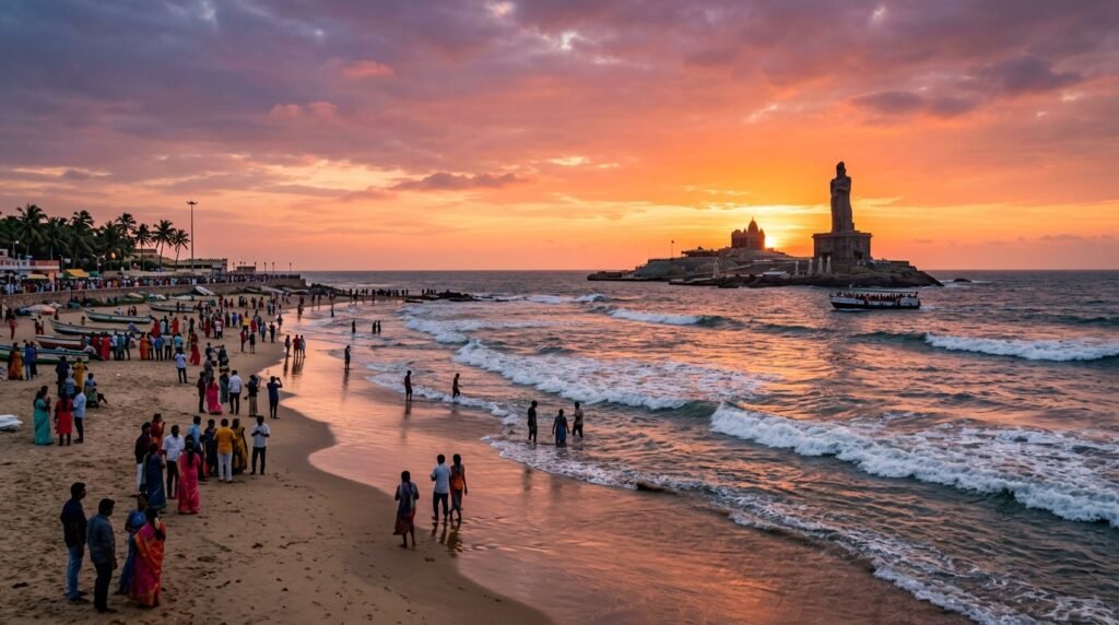 Kanyakumari Beach is the boundary of the three seas. The sunset here also is said to be dramatic in colour on wide water.