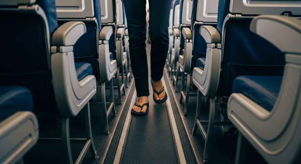 Footwear matters when moving around an aircraft. Bare feet or flip-flops raise risks since lavatories and hallways can be dirty in ways passengers do not see. Spills happen, germs linger – shoes help block harm. A closed design offers stronger shielding under real conditions. Safety often hides in small choices like these.