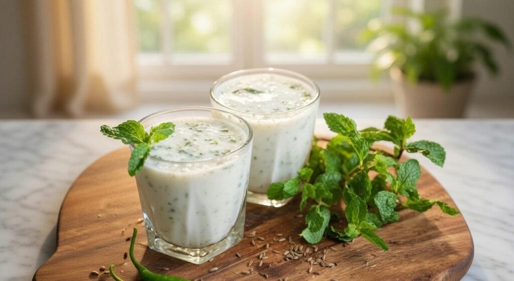 Chaas (buttermilk) is light, cools and contains exceptionally high amounts of probiotics. It is spiced with roast cumin and black salt as a digestive tonic to clean the gut following eating.