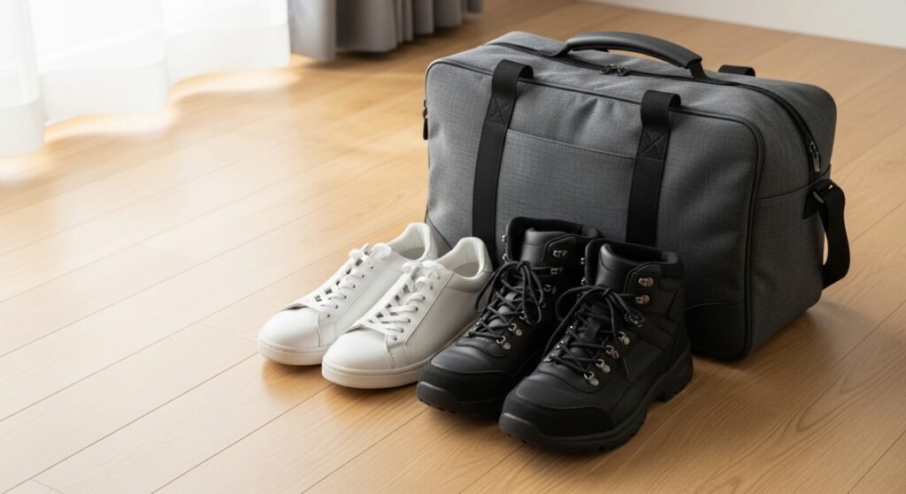 Shoes take up the most space. It is recommended that one should bring one extra pair and wear bulkiest ones only when on the road by professionals.