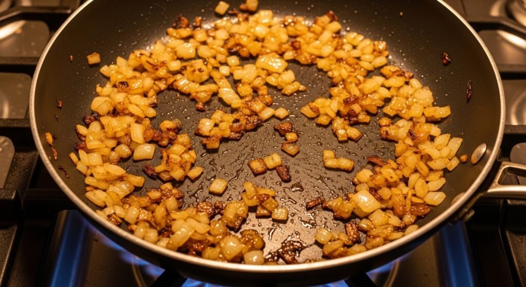 Take your time with onions. They are to be cooked rather than lightly sauteed. This caramelization is naturally sweet and confers the body to the mandible of a tasting bhurji.