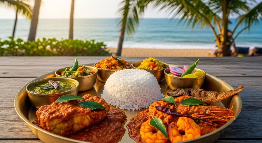 Goan thali is a blend of Portuguese flavor and sea-coast flavor. Crustacean, food prepared in coconut gravy and rice, nilafeli keema, sohol kadhi, and pickles bring the food its freshness and the spicy flavor of the culinary identity of the state of the state.
