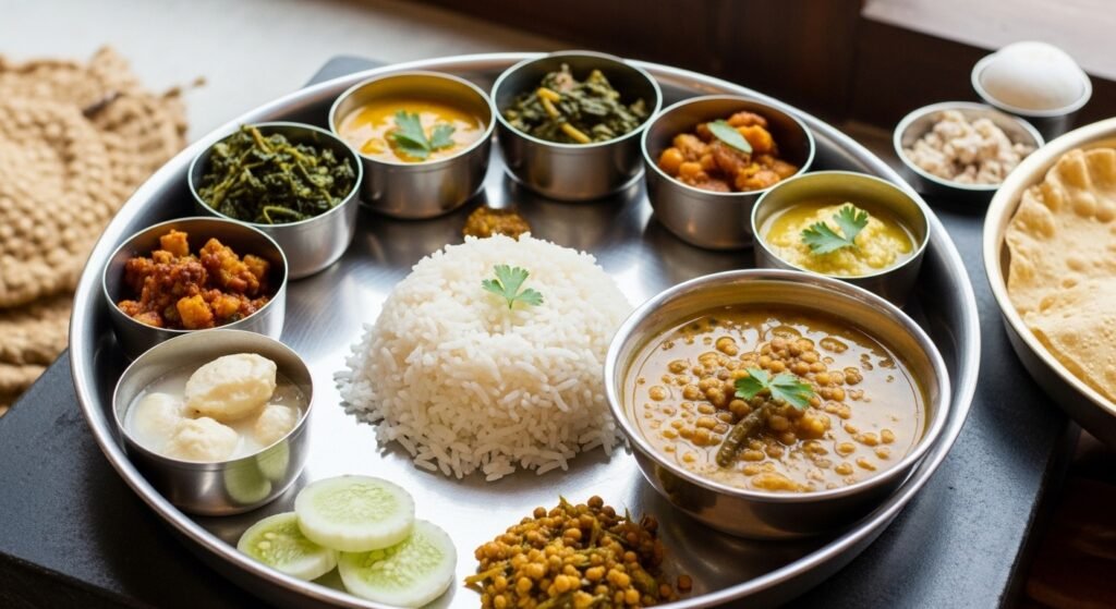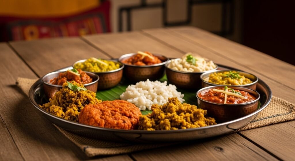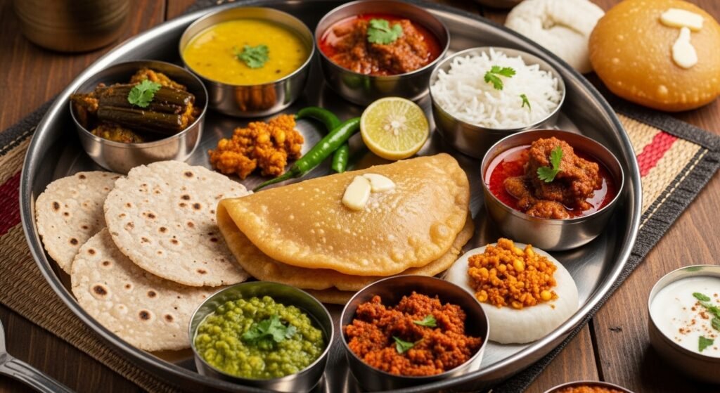 The Maharashtrian food thali is localized and is in multi choice so that it does not quit Maharashtrian spicy Kolhapuri gravies to the mild varan dal. Bhakri, puran poli, sabzis and tangy chutneys are being prepared to make up a mixed plate that is a symbol of the diverse food and geographical pattern of the state.