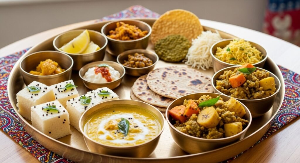 A thali of Gujarati is a perfect mix of sweet as salty and tangy. It is an assortment plate comprising foods such as dhokla, kadhi, undhiyu, thepla and farsan and a touch of sweetness in the vegetables and dal which makes it a unique plate rejuvenating and one of a kind.
