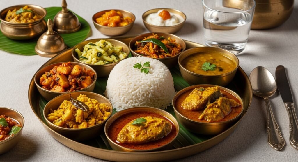 A Bengali thali glorifies the spices and sea foods. The piquant preparations commense with and the twist to fish curries, rice, chutney and sweets such as mishti doi, the meal is made with thoughtfulness and the order indicating the high culture the culinary culture of the Bengal.