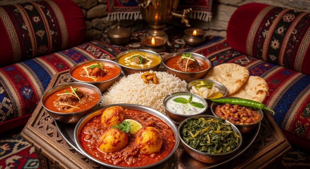 The Kashmiri thali makes such preparations as dum aloo, haak saag, rajma, and rich gravies however they are inspired by the Wazwan tradition which is notorious. This spread to the north is characterized as spicy and light-heavy.