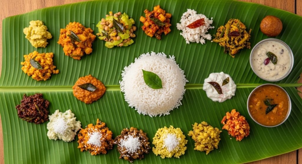 Sadya is a feast prepared in Keralas in case of festivals and it is vegetarian. Food is mainly rice that is accompanied by avial, olan, thoran, sambar, pachadi and payasam. The feast meal is made out of coconut in various ways, in the sweet taste.