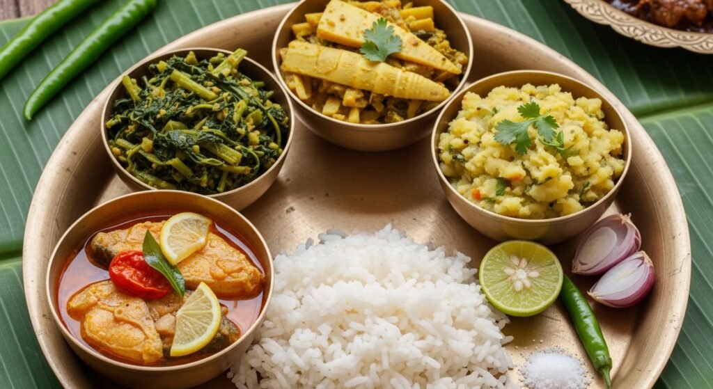 Assamese thali is also spicy and light with special touch to fresh produce and spicy ingredients. Clean earthly plate covers rice, tenga fish curry, preparations of mashed vegetables, greens and bamboo shoot preparation that seems to be the gift of nature of the region.