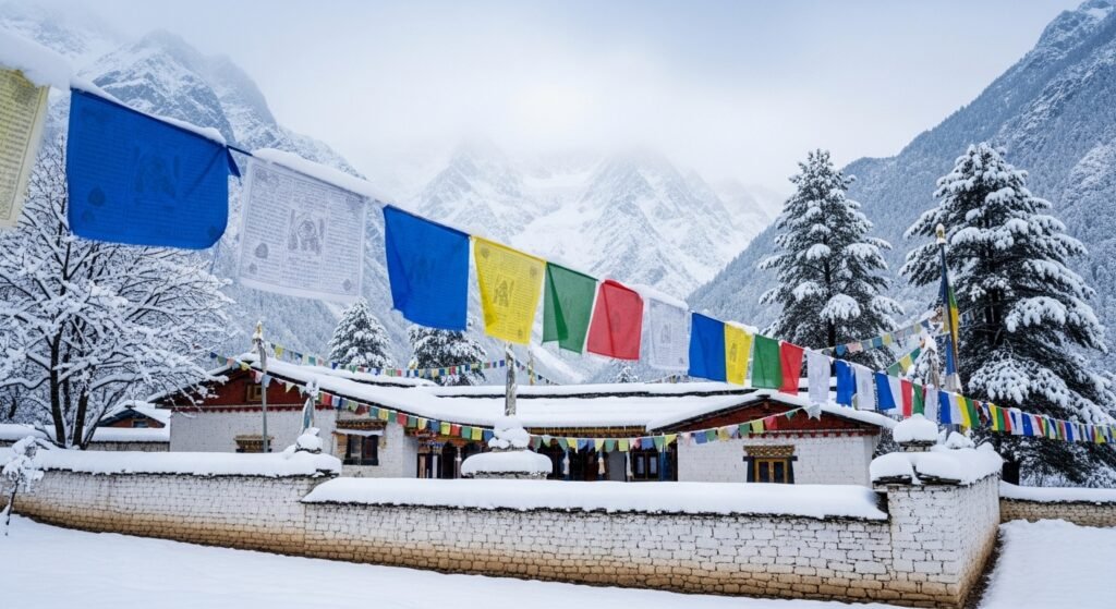 Winter Tawang is a snowy place. The white mountains have monasteries near the background and the entire scene is clean and serene that provides one with a strange uncivilized Himalayan winter getaway.