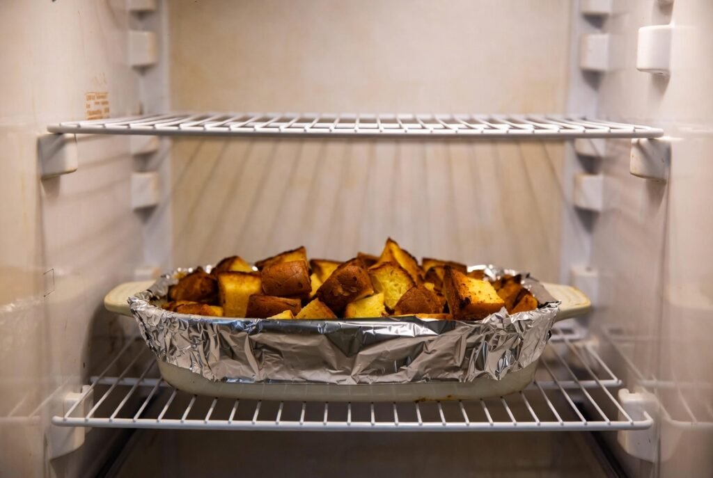 It is desirable to allow the assembled casserole to be allowed to cool over a period of several hours or overnight. This allows the bread to absorb all the custard mixture. It is done to have evenly baked dough and to avoid an arid or lumpy texture.