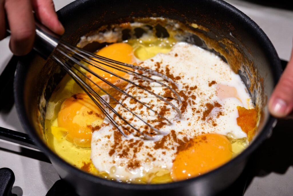 Eggs, milk, pumpkin puree, brown sugar, vanilla, cinnamon, nutmeg, and a pinch of salt make sucha natural French toast texture. It soaks into the cubes of bread, and it imparts warmness of the fall with each bite.