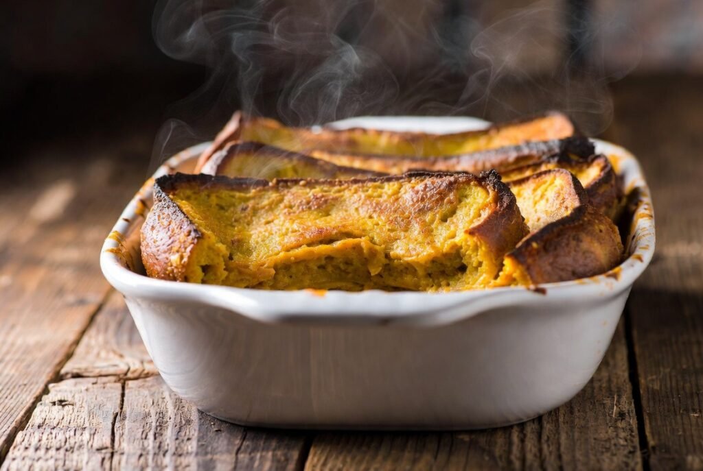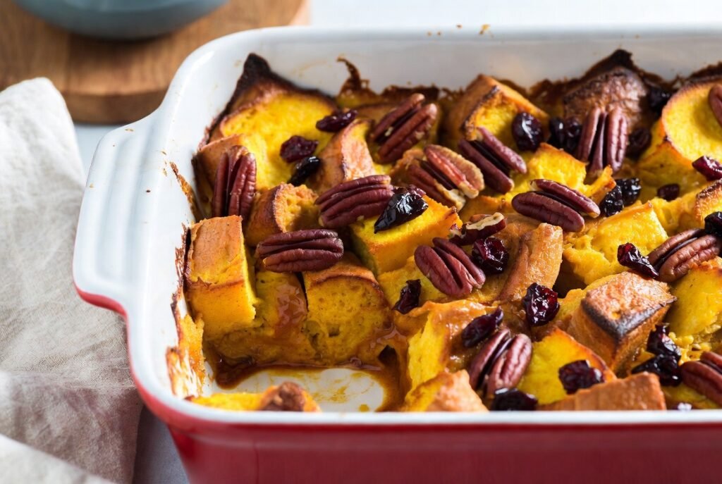 Thick and thick bread such as brioche, challah or day old French bread can be used to make the casserole gain its volume. These breads absorb the pumpkin custard and do not get soft, thus forming a tender belly with rather thin edges.