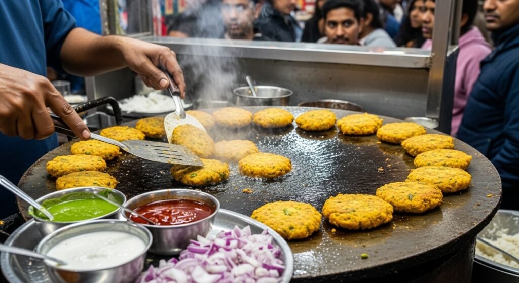 Aloo Tikki is a manufacturer of batter form of deep-frying and crisp potatia fritters. The street vendors cook it in huge hot griddles and the process of cooking will be confusing to the tourists.