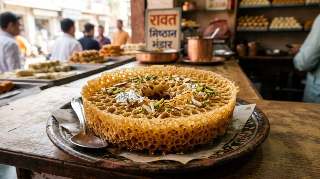 Ghewar represents a special dish from Jaipur which locals create during festival celebrations by making a dessert that resembles a honeycomb shape. The product comes in three different varieties which are basic, sweet, and “Malai” styles. Sambhar Fini Wala serves as the best location to enjoy this crispy dessert which comes bathed in syrup.