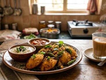 The snack includes a big green chili which comes filled with spicy potato mash and coated in gram flour before being fried until it becomes crispy and the snack offers a crunchy and spicy flavor which makes it an ideal companion for hot tea during rainy weather.